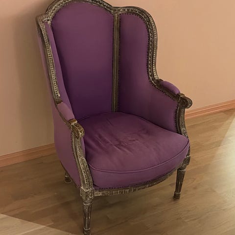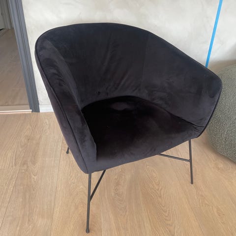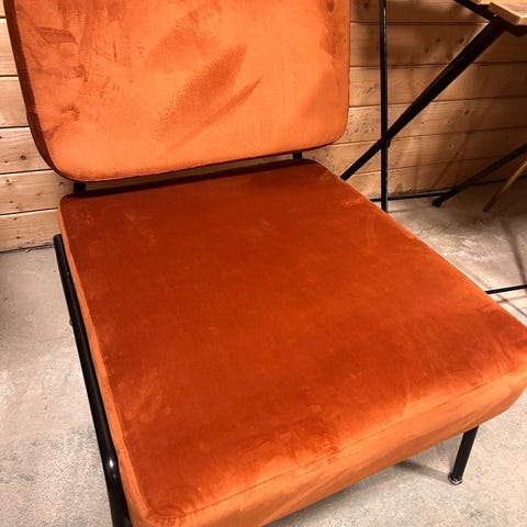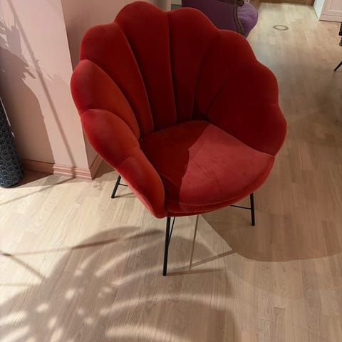 Selger denne lekte lenestolen i rustrødt velur stoff da vi ikke lenger har plass til den. Svært pent brukt uten slitasje eller flekker.