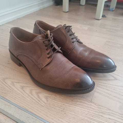 Italienske håndlagde Long life sko. Godt og synlig brukt, men blir vel fine igjen etter litt stell.