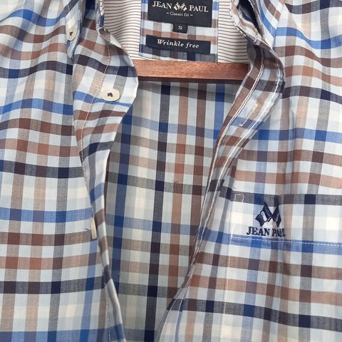 Jean Paul Arnaud skjorte med kort erm for herre i størrelse S. Skjorten er laget av 100 % lin og har rutemønster i blåtoner. Klassisk krage, knappestolpe foran og brystlomme med liten logo. Passer som lett sommerskjorte eller til hverdagsbruk.