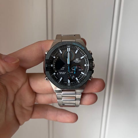 Ny pris!!! Casio Edifice herreklokke i rustfritt stål. Klokken har sort urskive med blå detaljer og flere delskiver for ekstra funksjoner. Datovisning er plassert ved klokken 4. Bezel med blå ring og minuttskala. Lenke i stål med foldespenne. Analog visning med markerte timemarkører og visere. Passer som hverdags- og penklokke for herre.
