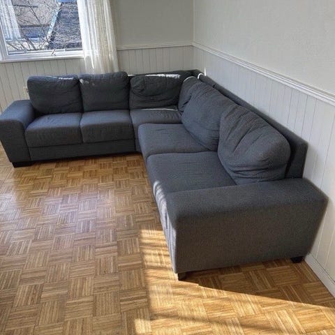 Stilig, men godt brukt skinnsofa gis bort mot henting grunnet slitte seter, men jeg tror disse kan bli fine hvis man legger litt kjærlighet i det. Foruten de to putene det er nærbilde av er skinnet egentlig veldig fint.