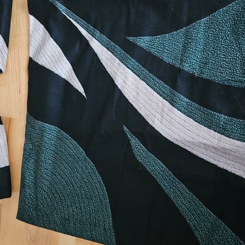 Den ser eksklusiv og luksuriøs ut, litt shiny velvet-aktig stoff og gir effekten av metallisk/"gull"/"bronse". Litt art deco / egyptisk mønster.