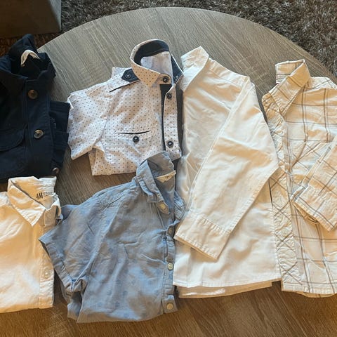 Fire skjorter i str 92, ei blå og tre kvite. Små flekkar på to av dei, sjå bilda. Har ikkje prøvd å få dei vekk.
