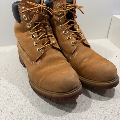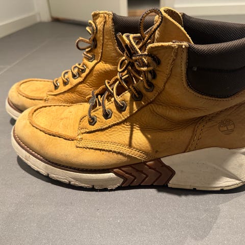 Timberland støvler i størrelse 45. Klassiske ankelhøye støvler i brunt skinn med snøring og kraftig yttersåle. Polstret kant rundt ankelen for økt komfort. Egnet som fritids- og hverdagsfottøy i varierende værforhold.