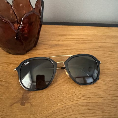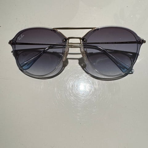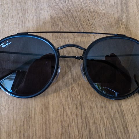 Rayban Round Metal Double Bridge solbriller selges billig da rammen har fått en miniskramme (ved siden av logoen). Man ser ikke skrammen på avstand. Har ikke etui. Nypris 1600,-