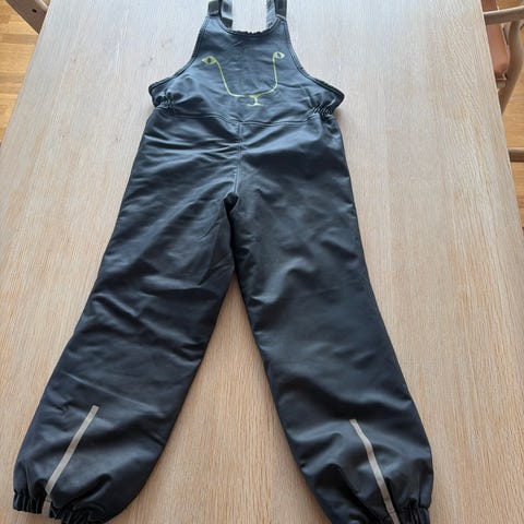 Kattnakken regnsett for barn i størrelse 128, unisex. Settet består av regnjakke og selebukse. Buksen har mønster med små figurer og strikk nederst i bena. Vannstopper på armer og ben. Jakken har hette, glidelås og trykknapper foran. Materialet har påtrykte vaskeanvisninger og refleksdetaljer. Egnet som yttertøy i vått vær for barn i størrelse 128. Mangler en knapp. Ellers ingen hull og mye god bruk igjen.
