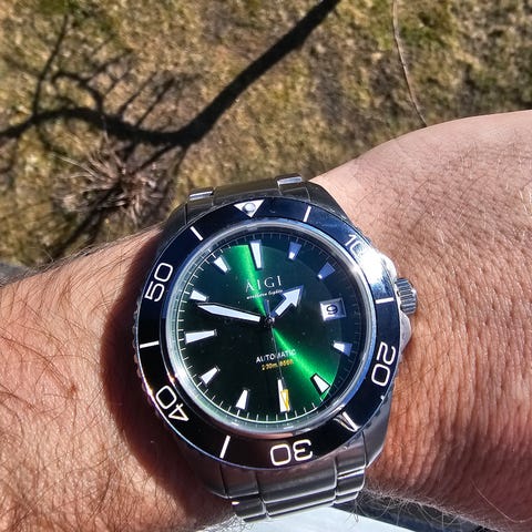 Ubrukt Kompass Stockholm ur med nydelig grønn bølgemønster urskive og bezel insert.