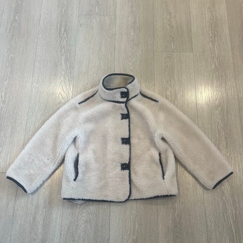 Reserved jakke for dame i størrelse 36. Jakken er beige og laget i polyester med myk, pelslignende overflate. Modellen har krage, glidelåslukking foran og dekorative detaljer i kontrastfarge ved ermer og langs sømmer. Innside med glatt fôr for bedre komfort. Passer som ytterjakke i kjøligere vær.
