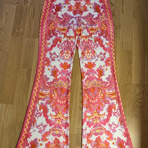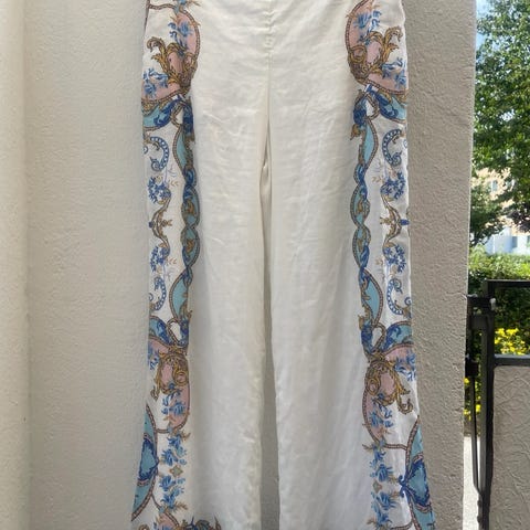 Hale Bob sett med bluse og bukse for dame i størrelse S. Sett i lin med flerfarget mønster i hovedsak hvit bunn med blå og beige detaljer. Blusen har lange ermer, v-utringning og dekorative mønsterfelter foran og på ermene. Buksen er rett og vid med mønster langs sidene og nederst på bena. Passer til bruk vår og sommer eller til anledninger der et lett og mønstret sett er ønsket. Lekkert sett fra Hale Bob, følger med belte i samme mønster. Hale Bob er et dyrt merke, selges rimelig så her gjør du ett kupp. Kjøpt hos deg og meg i Lillestrøm 🤗