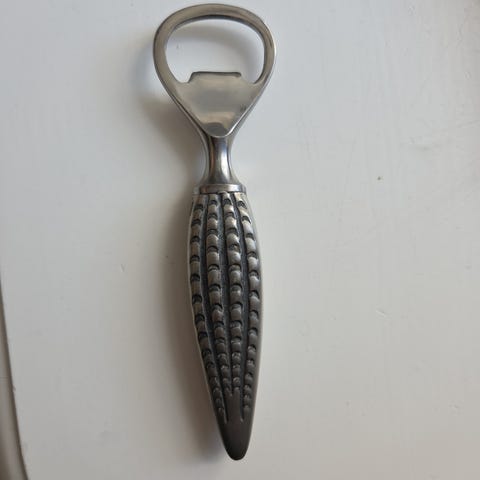 Tinn-Per flaskeåpner i metall med viking motiv på håndtaket. Håndtaket har detaljert preget overflate, og baksiden er merket "Tinn-Per Norway".