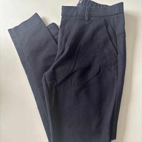 Five Units Angelie bukse for dame i størrelse S. Buksen er blå (navy) og har en smal, klassisk passform med beltehemper og skrålommer foran. Materialet består hovedsakelig av bomull med innslag av nylon og elastan for økt komfort og stretch. Passer til hverdagsbruk og mer formelle anledninger.