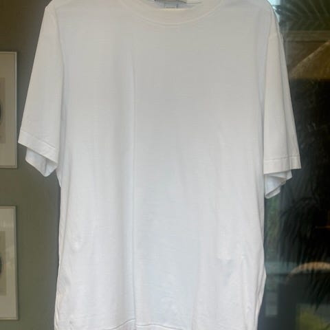 Zara T-skjorte for herre i størrelse L. T-skjorten er hvit og laget av bomull. Klassisk modell med kort erm og rund hals. Passer til hverdagsbruk alene eller under genser og jakke.