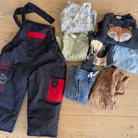 Brukte klær med lang brukstid igjen. Fire gensere, fem trøyer, tre t-skjorter og fire bukser. Str. 98