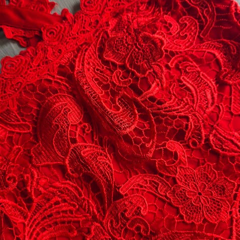 festkjole for dame i størrelse M. Kjolen er rød og laget i polyester. Den har blondedetaljer og v-utringning, slik bildene viser. Egnet som festkjole eller til andre anledninger der en pen kjole ønskes.