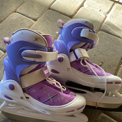 Aspen Sport justerbare barneskøyter i størrelse 30-33. Modellen har plastskall og myk innersko. Skøytene har rosa og hvite detaljer med snøkrystallmønster, og lukkes med spenner og borrelås for enkel tilpasning. Egnet til barn som trenger stabile skøyter til lek og enkel skøyting på is.