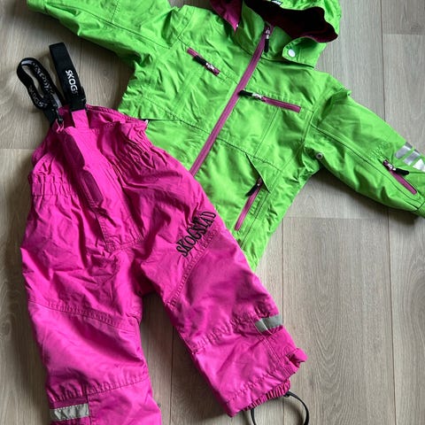 Klærne er godt brukt, men fortsatt i fin stand uten hull eller skader. Varm jakke med fleecefor, snøstopper i livet, reflekser og avtagbar hette. Bukse med justering i livet og fotstropper. Perfekt som barnehage- eller reservevinterdress.