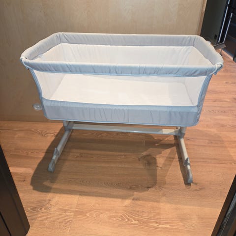 Bedside crib i hvit utførelse. Den står på hjul for enkel flytting. Overflaten har noen merker og småskader i lakken, som vist på bildene. Passer til standard madrass for bedside babyseng.