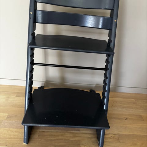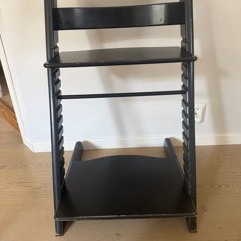 Stokke Tripp Trapp høy barnestol. Malt svart. Stolen har justerbart sete og fotbrett som kan flyttes i høyden etter barnets størrelse. Egnet som spise- og sitteplass ved bord for barn. Klassisk konstruksjon i heltre som gir stabilitet og god støtte for barnets sittestilling.