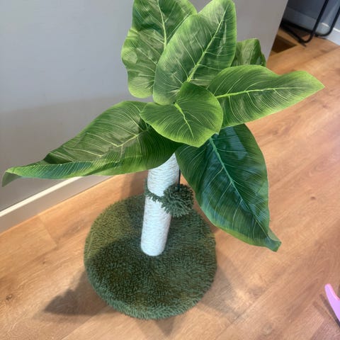Klatrestativ med klorestolper til katt. Med tunell og ball i strikk. Ca 85cm høyt, og platene er ca 36x36cm. Har bare stått og samlet støv, da vår gamle katt aldri har vist interesse for denne.