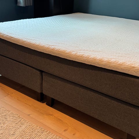 Jensen kontinentalseng. Sengen består av to underdeler + madrass og overmadrass.