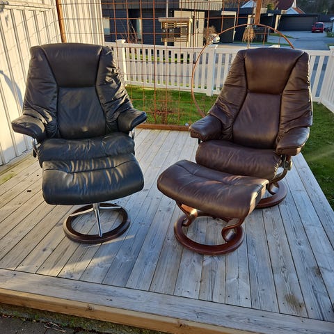 2 flotte Ekornes Stressless i skinn selges med fotskammel. Stolene er i god stand og veldig behagelige å sitte i. Selges samlet for 10 000kr.