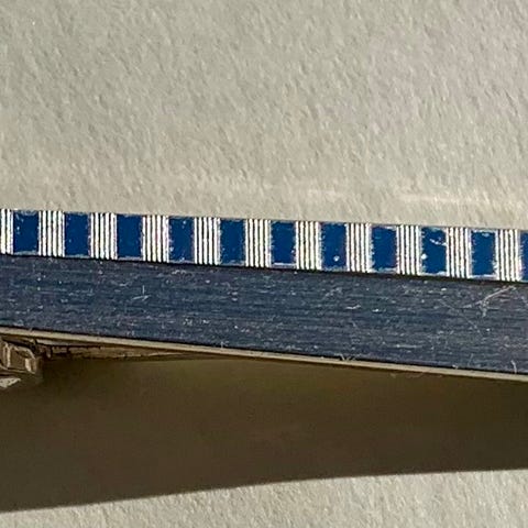 Selger en pent brukt slipsnål. Den er sølvfarget med noen små gullfargede detaljer.