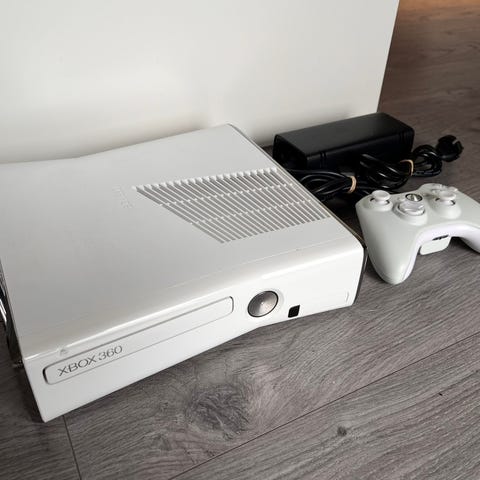 Microsoft Xbox 360 spillkonsoll med tilbehør. Konsollen leveres med to trådløse håndkontrollere i hvit farge, strømforsyning/strømadapter og kabler som vises på bildene. Det følger også med en egen mediefjernkontroll til Xbox 360.