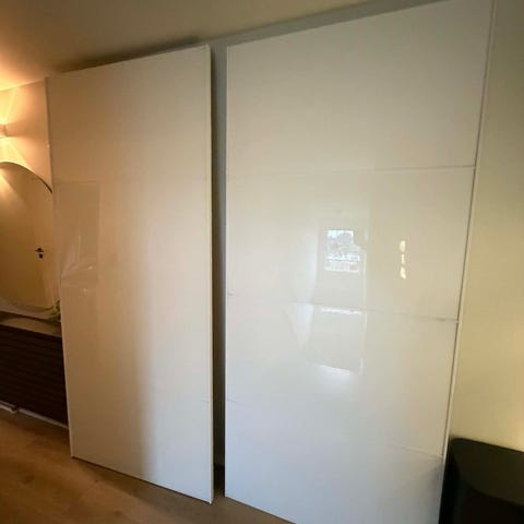 Hvitt IKEA oppbevaringsskap med glansede dører og i god stand gis bort mot demontering og henting. Det er push-open / trykk-åpne beslag på dørene. Må hentes senest fredag. Gis bort til den første som kan demontere og hente.