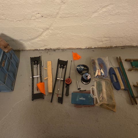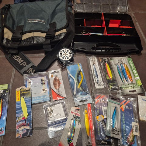Fiskesett med diverse utstyr til sportsfiske. Inneholder blant annet flere typer sluker, kroker, søkker og dupp, samt ulike snører på sneller og spoler. Det følger også med oppbevaringsbokser og mindre tilbehør til montering av takkel og fortom. Egnet for variert fiske fra land og båt, både i ferskvann og saltvann, avhengig av hvilke deler som benyttes.
