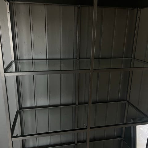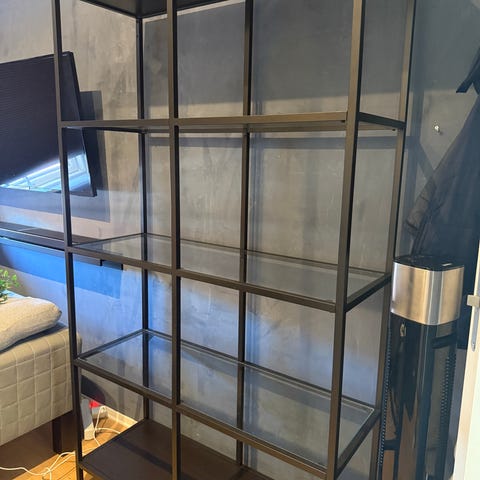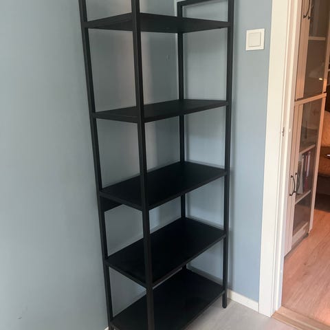 hylle i svart metall. Åpen, reol-lignende konstruksjon med flere hyllenivåer som gir god plass til oppbevaring eller utstilling av gjenstander. Passer til bruk i stue, soverom, gang eller kontor der det er behov for oversiktlig lagring på høyden.