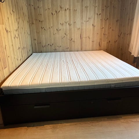 Sengen har mørk ramme og skuffer integrert i sengebunnen for ekstra oppbevaringsplass. Madrassen er av typen Sultan Saltn fra IKEA.
