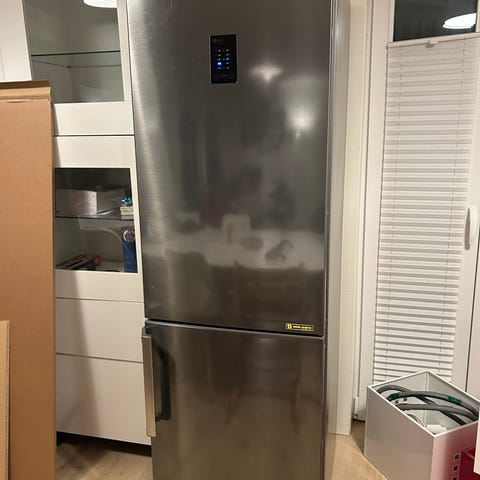 Kombiskapet har separate dører for kjøl og frys og et display øverst på fronten for innstillinger og temperaturvisning. Kjøleskapet vaskes og tømmes når det blir solgt. Er noen pizzaer i frysen fortsatt.