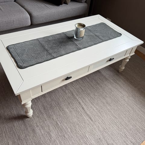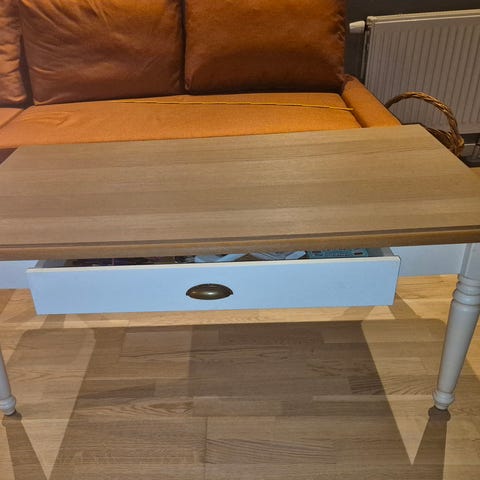 Selger et solid og pent salongbord i heltre eik. Bordet er nylig pusset ned og behandlet på nytt. Bordplaten er behandlet med hardvoksolje som fremhever treverket og gir en slitesterk overflate. Underdelen er malt i en lys, nøytral farge som gir et moderne uttrykk.