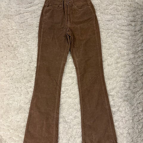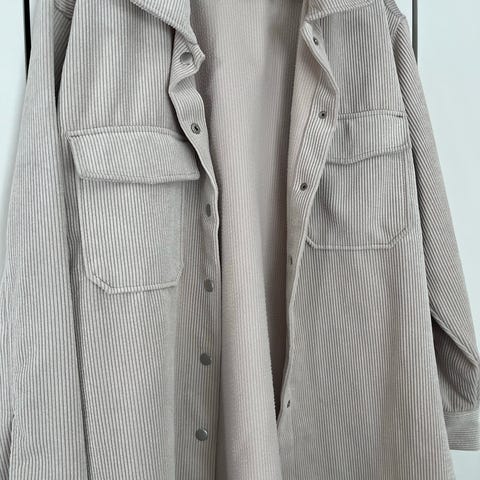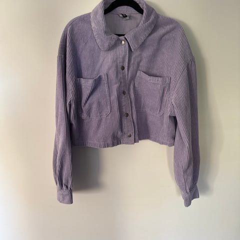 Cropped skjorte i cordfløyel str XS. 65% bomull, 33% polyester, 2% elastan. Fargen er litt kremhvit.