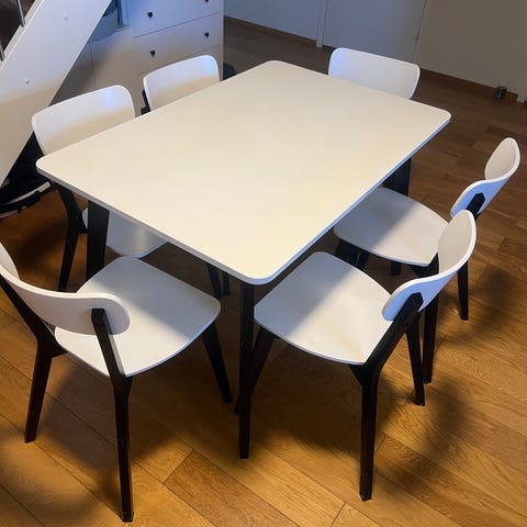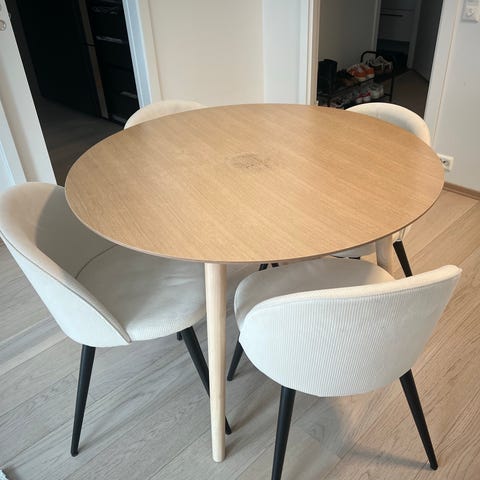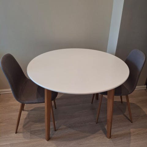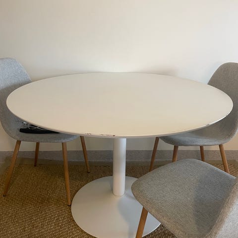 Noe flekker på bord. Ene stolen mangler en skrue for å være stabil, ellers i god stand.