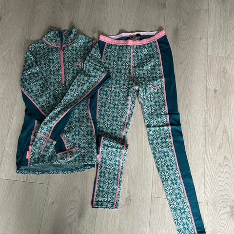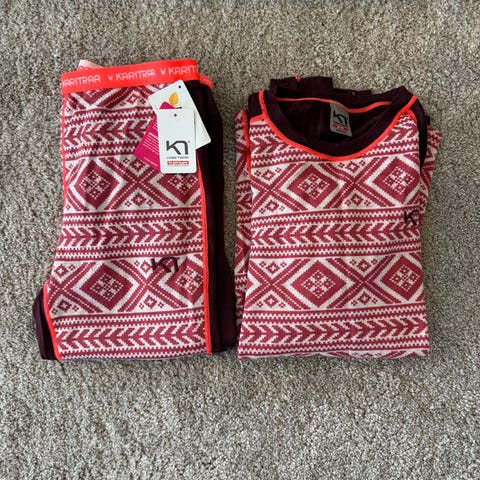 Kari Traa ullundertøysett for dame i størrelse S. Sett med langermet overdel med knappestolpe og tilhørende longs. Farge i burgunder med mønstret design og kontrastsømmer. Tightsen har en liten rift i siden, som er sydd igjen. Veldig lite synlig når den er på.