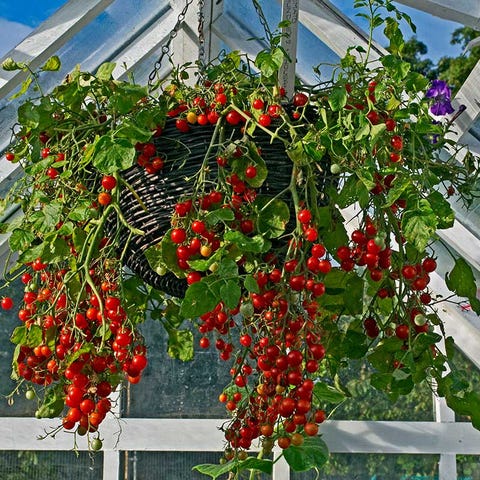 Gir 100-vis av søte, ganske små cherry tomater som vokser i lange klaser - som perler på en snor! Planten blir ca. 1*1 meter. God snack tomat, fin som garnityr, i salaten og på brødskiva. Anbefales om man vil ha en plante som leverer kaskader av søte små cherry tomater.
