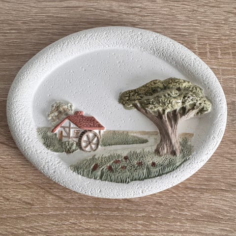 Dekorativ veggplate med motiv fra Røros. Motivet viser «Kirken og hyttklokka» i relieff, med detaljerte bygninger og kirkespir. Platen er rund og har opphøyd kant med tekst rundt motivet. Den er laget i et tre materiale. Baksiden er glatt. Egner seg som veggdekor eller suvenir fra Røros.