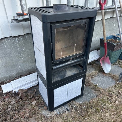 Vedovn i hvit utførelse. Ovnen har frontmontert glassdør med metallramme og håndtak på høyre side. Under ildstedet er det en nisje som kan brukes til oppbevaring av ved eller tilbehør.