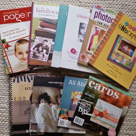Samling med ulike bøker om scrapbooking og kortlaging. Inneholder flere titler med trinnvise forklaringer, ideer og inspirasjon til utforming av album, kort og andre papirprosjekter. Bøkene viser teknikker, bruk av bilder, dekor og tekst, samt forslag til oppsett og design. Egnet for både nybegynnere og mer erfarne innen scrapbooking og kreativ kortlaging.