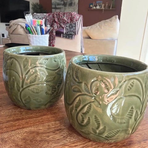 Små potteskjulere i keramikk, lysegrønne med glasert overflate og lys bunn. Høyde er ca. 7 cm og diameter ca. 6 cm, egnet til for eksempel små påskeliljer. Selges som sett på 3 stk.