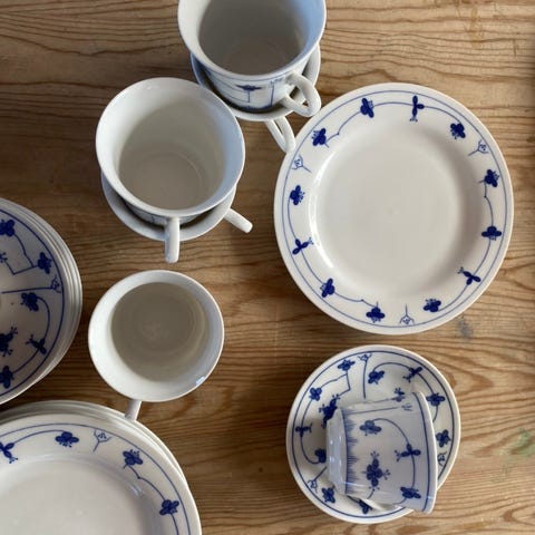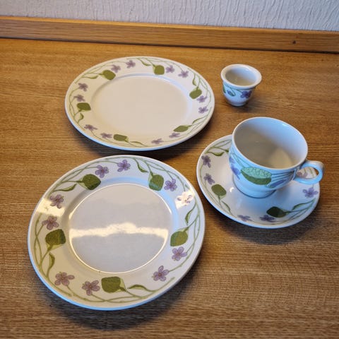 Koselig kaffeservise med blåbærmotiv. 8 kuverter. Asjett 18 cm. Kr 75 pr kuvert eller kr 500 samlet. Har 3 ekstra asjetter og 1 ekstra skål som kan følge med hvis ønskelig. Serviset har ingen synlig skade eller slitasje. Kan sendes mot at kjøper betaler frakt.