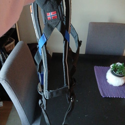 Selen er svært justerbar rundt både hals og bryst. Fire spenner på sidene gjør det enkelt å ta selen av og på.