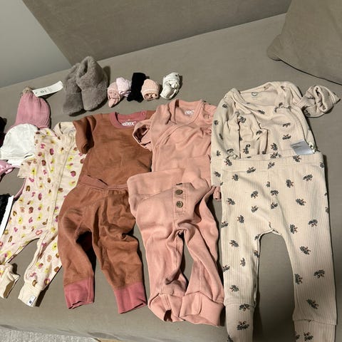 Bodyer og bukser for baby, unisex. Pakken inneholder flere bodyer i størrelse 68 i ulike lyse farger og mønstre. Både lange og korte armer. Blå bukse med knyting i livet er i bomullsmusselin. De fleste fra H&M, bukse med rev på rumpen er fra KappAhl.