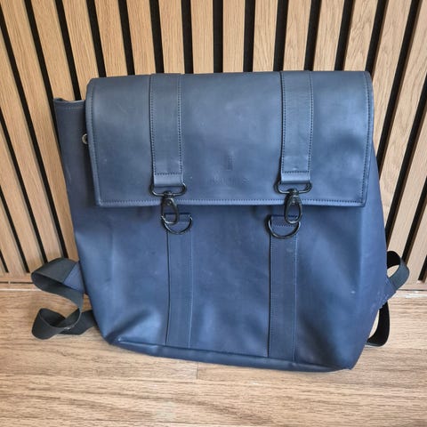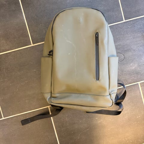 Pent brukt sekk fra Rains. Vanntett og lett. Materialet er glatt kunstlær som er enkelt å tørke av. Passer til daglig bruk, skole eller jobb, med plass til det mest nødvendige i hovedrommet.