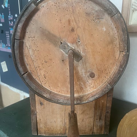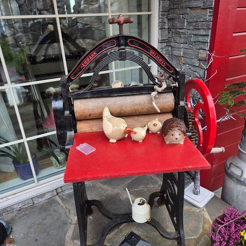 Bicycle manuell klesrulle i tre og metall. Klesrullen har treverk med påtrykt tekst og dekor, samt metallmekanisme med sveiv. Den er utstyrt med to valser for vridning av vann ut av tekstiler. Egner seg som funksjonell klesrulle der det er ønskelig, eller som dekorativt og tidsriktig innredningselement i hjem, hytte eller utstilling med historisk preg.