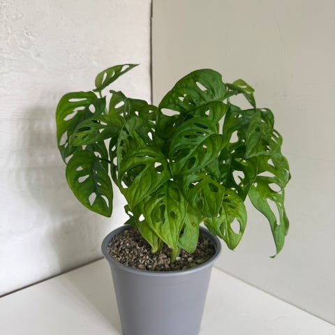 Monstera adansonii potteplante med grønne, gjennombrutte blader. Planten står i en enkel plastpotte med underskål. Egner seg som inneplante på bord, hylle eller vinduskarm. Trives vanligvis i lyst miljø uten direkte sol og med jevn vanning når jorden har tørket lett opp på overflaten.