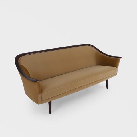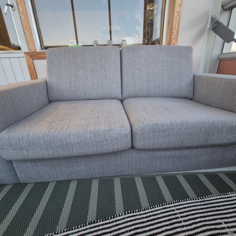 Swedese sofa med buet rygg og rette armlener. Sofaen har blå tekstiltrekk, sidepaneler i lyst tre og understell i metall med buede ben. Passer som sittemøbel i stue, entré, kontor eller fellesarealer. Nøytralt uttrykk som gjør den enkel å kombinere med annet interiør.