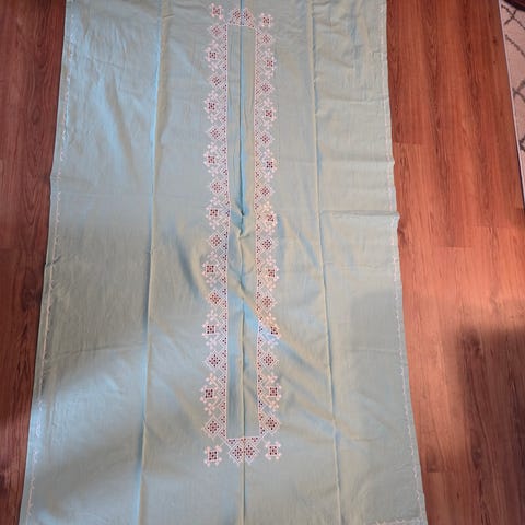 Vakre gardiner / portier i nydelig blågrønt ullstoff