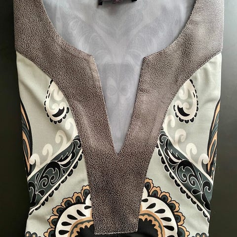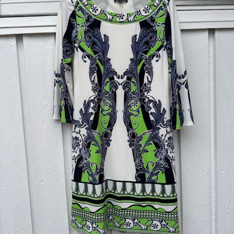 Hale Bob kjole for dame i størrelse S. Kjolen er laget i polyester og har et flerfarget, mønstret design i hovedsak i nøytrale toner. Modellen har lange ermer med lett utsvingt avslutning og v-utringning foran. Lengden går omtrent til over kneet, avhengig av høyde. Passer som hverdagskjole eller til enklere anledninger. Kun brukt en gang, fremstår som ny.